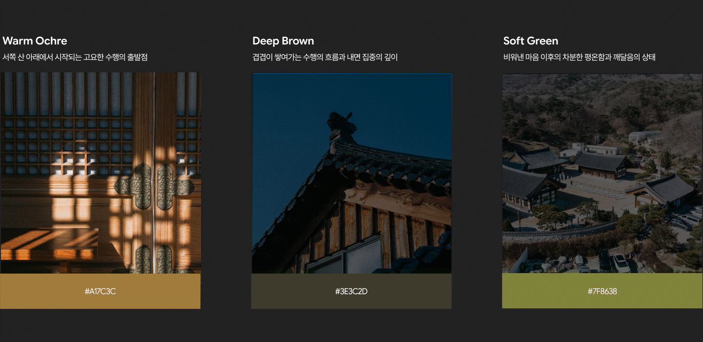 고요한 시작, 수행의 과정, 공(空)과 깨달음의 중심을 상징하는 조형을 통해 서축암만의 절제된 분위기와 깊이 있는 수행의 정신을 담아냅니다.